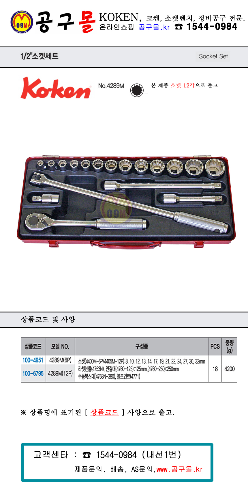 코켄 소켓세트(1/2-12각) 4289M-12P (18PCS) 4405M, KOKEN, 복스세트, 소켓세트,100-6795