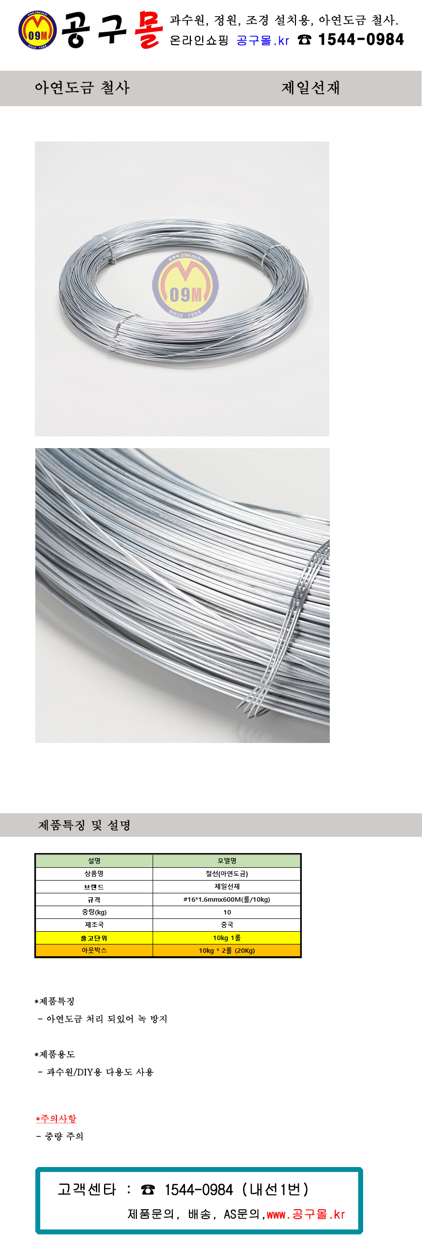 제일선재 철사 16x1.6mmx600M(10Kg) 아연도금, 도금철사, 아연철사, 73733