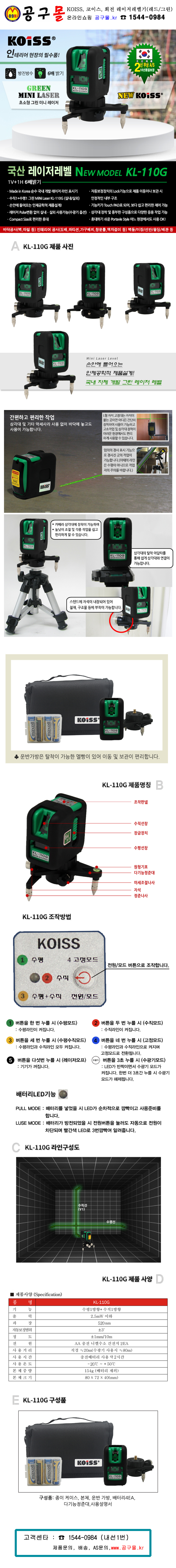 코이스 레이저수평(그린) KL-110G KOISS, 그린레벨기, 레이저레벨기, 427-3482