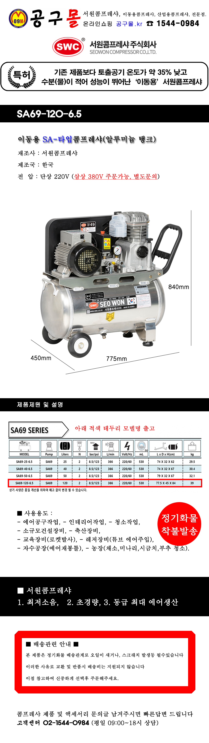 서원콤프레샤 SA타입 SA69-120-6.5 (120L) 220V SWC, 콤프레셔, 저소음, 초경량, 알루미늄탱크, 공구몰