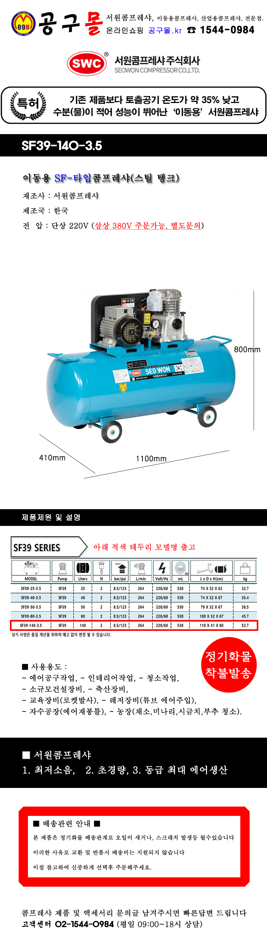 서원콤프레샤 SF타입 SF39-140-3.5 (스틸140L) 220V SWC, 콤프레셔, 저소음, 초경량, 스틸탱크, 공구몰