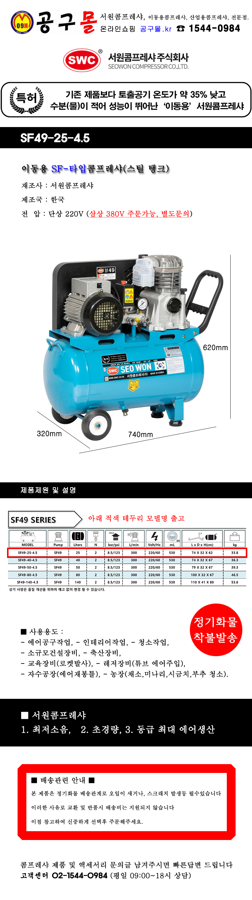 서원콤프레샤 SF타입 SF49-50-4.5 (스틸50L) 220V 콤프레셔, 저소음, 초경량, 스틸탱크, 공구몰