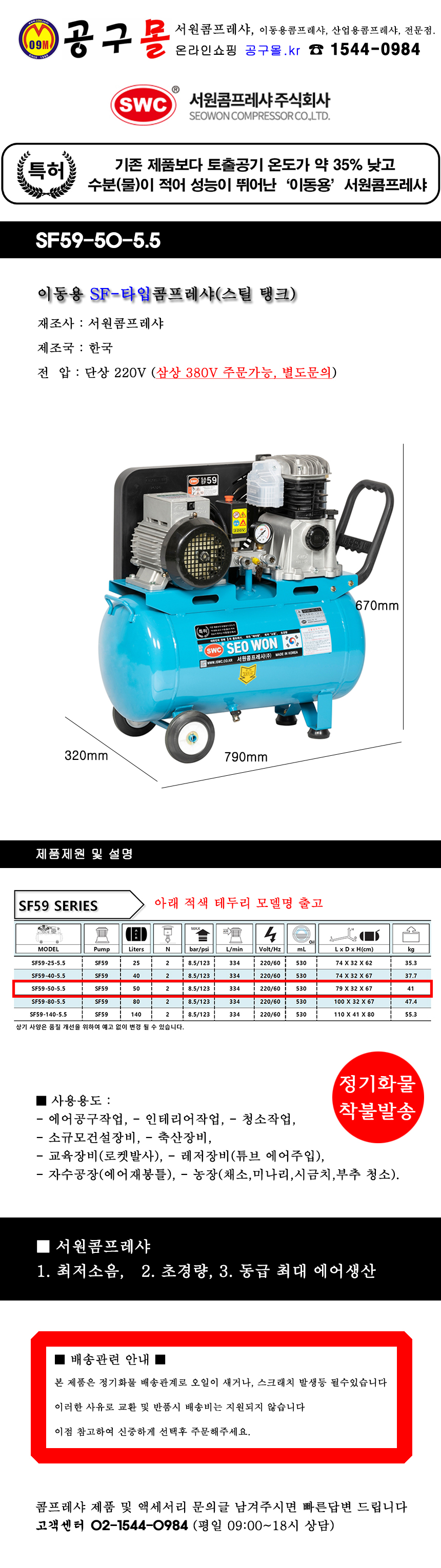 서원콤프레샤 SF타입 SF59-50-5.5 (스틸50L) 220V 콤프레셔, 저소음, 초경량, 스틸탱크, 공구몰