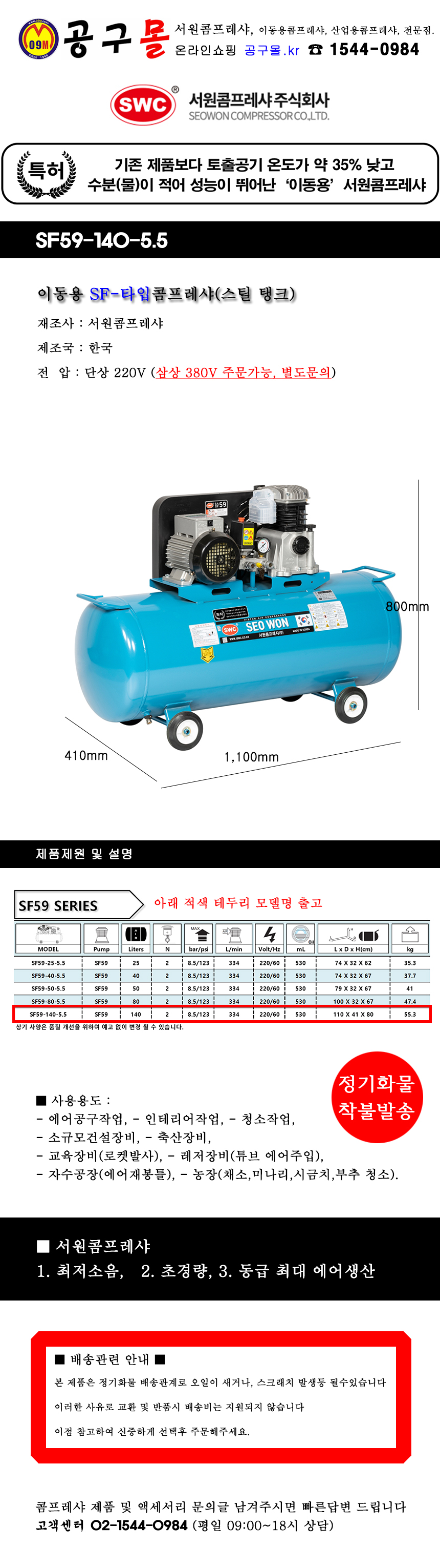 서원콤프레샤 SF타입 SF59-140-5.5 (스틸140L) 220V 콤프레셔, 저소음, 초경량, 스틸탱크, 공구몰