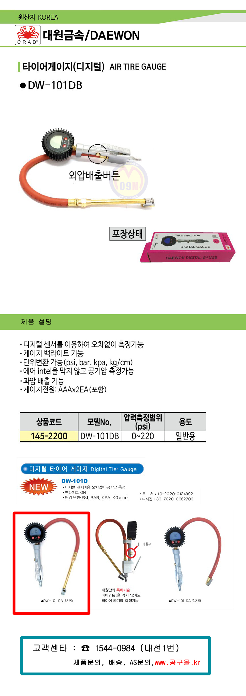 타이어게이지(디지털) DW-101DB(일반형) 대원금속/공구몰/자동차공구/자동차정비공구/타이어공구