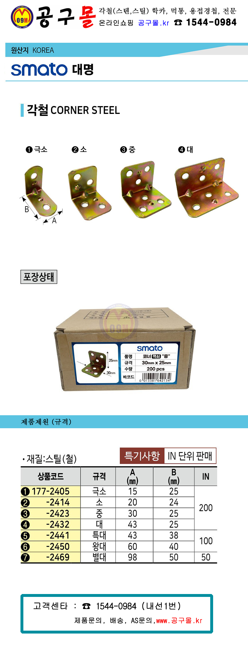 스마토대명 각철(box) 극소(15x25mm) 200개 SMATO 대명, 철코너, 스틸코너, 공구몰, 울산철물점, 177-2405