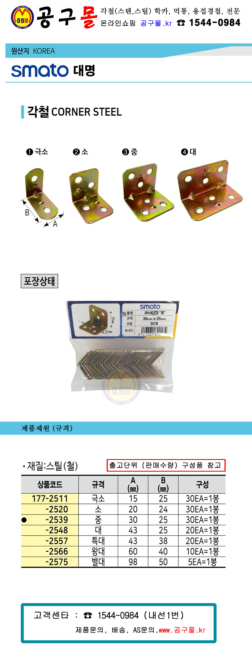 스마토대명 각철(봉지) 대(43*25) 세트포장(20EA) SMATO 대명, 철코너, 스틸코너, 공구몰, 울산철물점, 177-2548