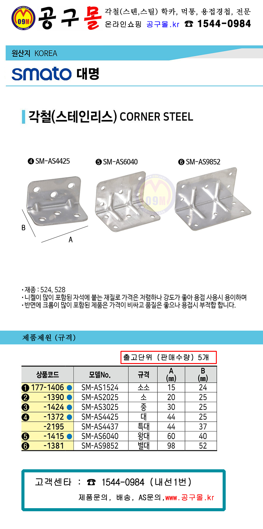 스마토대명 각철(스텐) SM-AS9852(별대) 5개 SMATO 대명, 스텐코너, 스텐레스코너, 공구몰, 울산철물점, 177-1381
