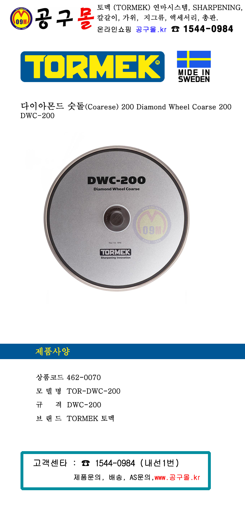 토멕 다이아몬드 숫돌 200mm DWC-200, TORMEK, 습식그라인더, 토맥, 나이프연마기계 부품, 462-0070
