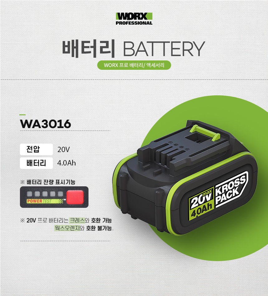 WORX 배터리 WA3016 (20V, 4.0AH) 웍스코리아, 웍스프로, WORX PRO