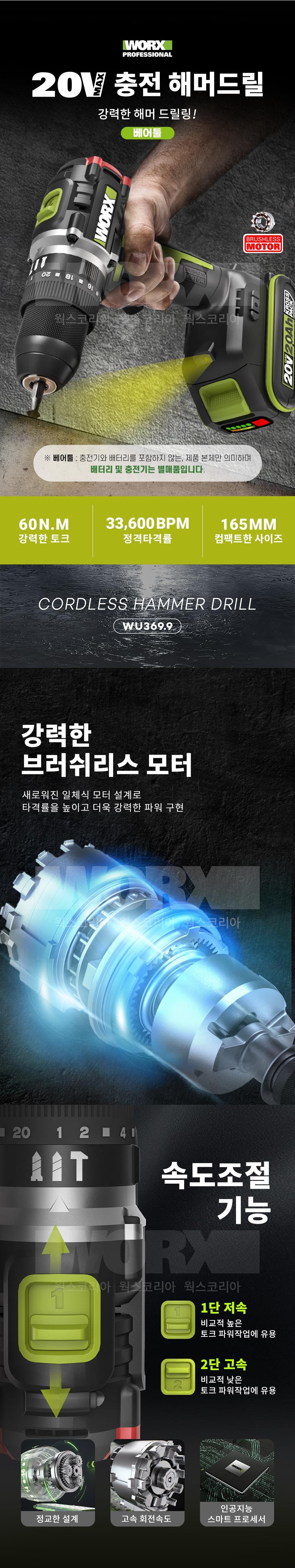WORX 충전해머드릴(베어툴) WU369.9 (20V, BL) 배터리, 충전기별매, 웍스코리아, WORXKOREA, 웍스프로, WORX PRO