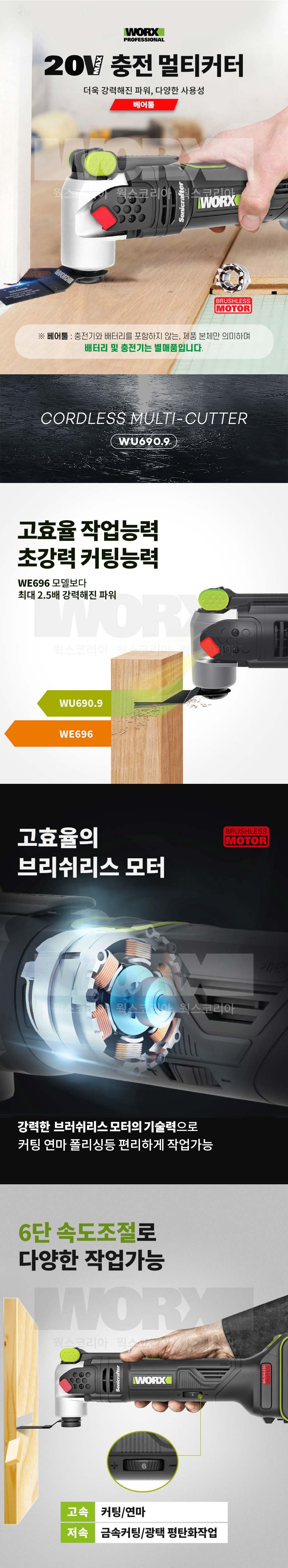 WORX 충전멀티커터(베어툴) WU690.9 (20V) 속도조절, 배터리, 충전기별매, 원형톱, 전기톱, 웍스코리아, WORXKOREA, 웍스프로, WORX PRO