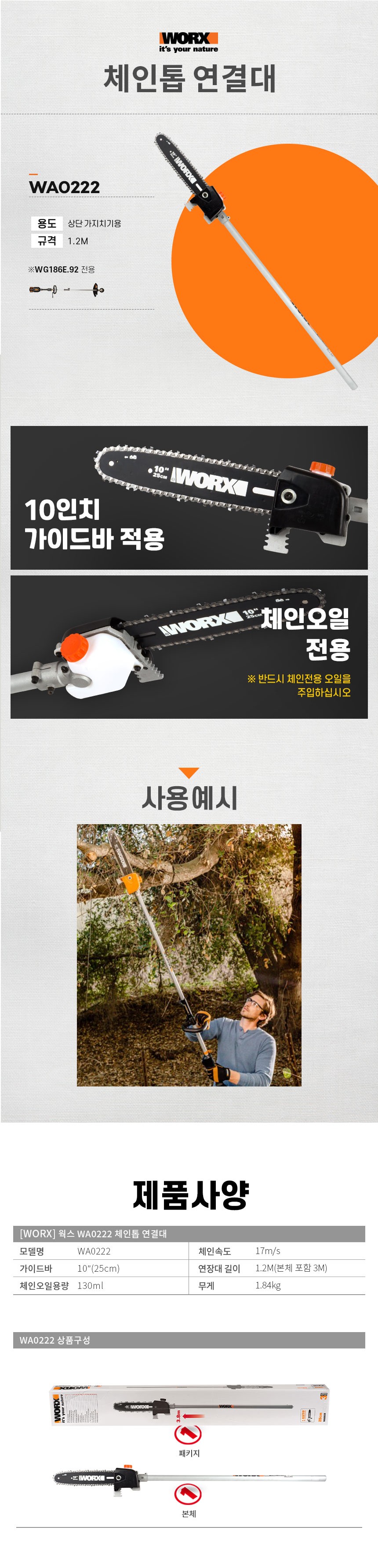 웍스 40V 고지톱 연결대 WA0222, 1.2M(본체포함3M) WG186E.92용 웍스오랜지, 웍스코리아, WORXKOREA, 웍스프로, WORX PRO
