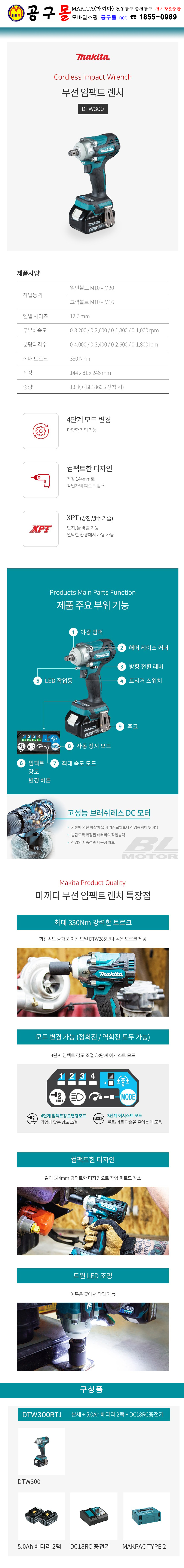 마끼다 18V 임팩트렌치 DTW300RTJ 18V-5Ah(2B)(12.7mm) MAKITA, 충전드릴, 드라이버드릴, 공구몰