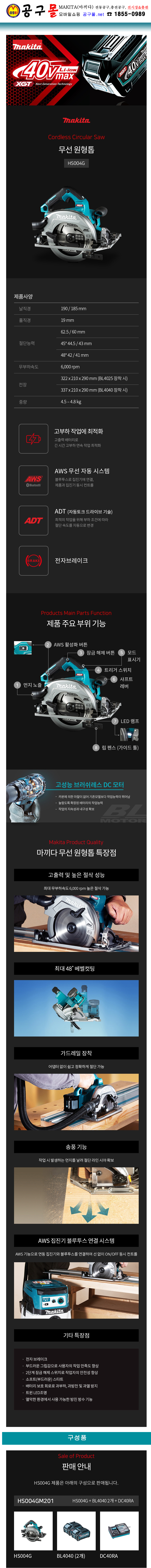 마끼다 40V 원형톱 HS004GM201 (4.0Ah,2팩) 190mm (BL, AWS) MAKITA, 공구몰, 전기톱, 목재톱