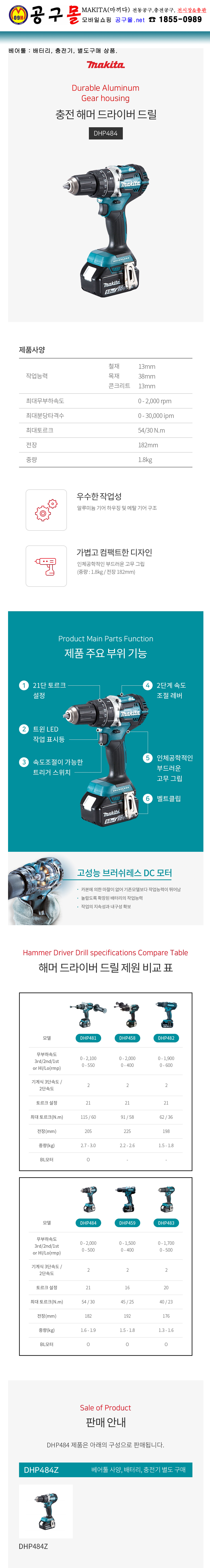 마끼다 18V 해머드릴(베어툴) DHP484Z (BL, 배터리, 충전기, 별매) MAKITA, 공구몰, SDS해머드릴, 충전해머드릴
