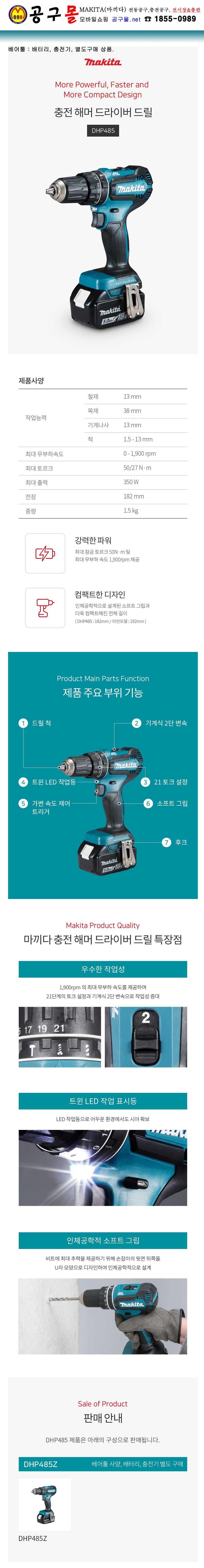 마끼다 18V 해머드릴(베어툴) DHP485Z (BL, 배터리, 충전기, 별매) MAKITA, 공구몰, SDS해머드릴, 충전해머드릴