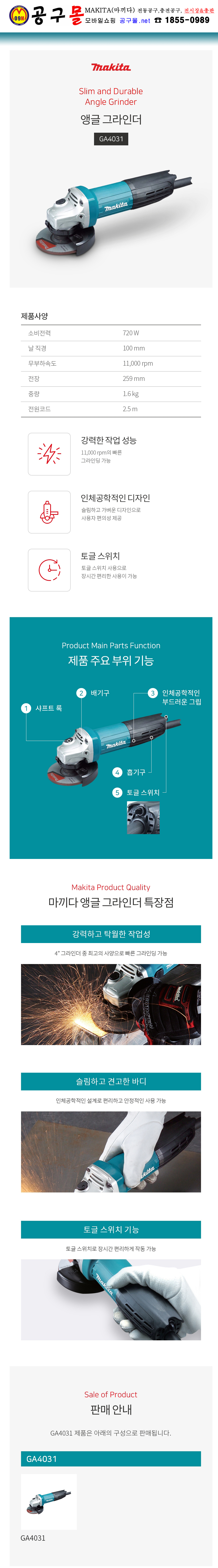 마끼다 앵글그라인더 GA4031 (100mm) 720W, MAKITA, 공구몰, 전기그라인더, 핸드그라인더, CB-459