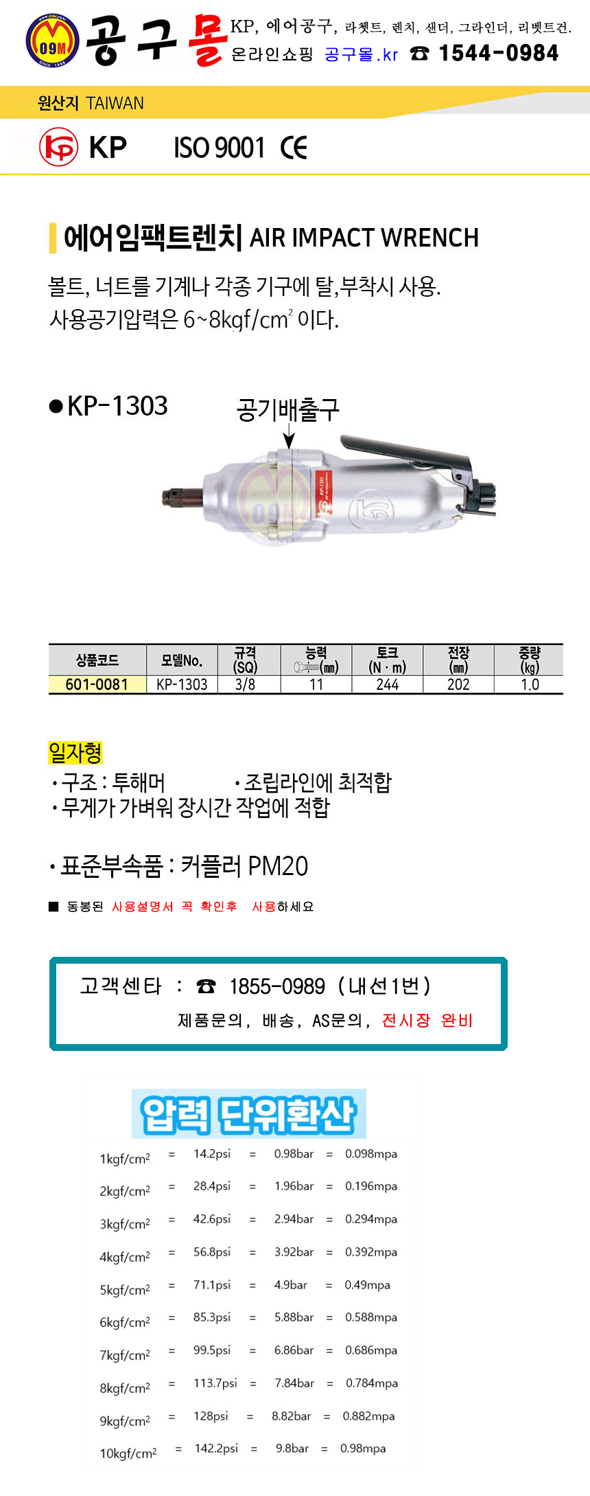 KP 에어임팩트렌치 KP-1303(3/8SQ)일자형 에어공구, 임팩트렌치, 에어렌치, 공구몰