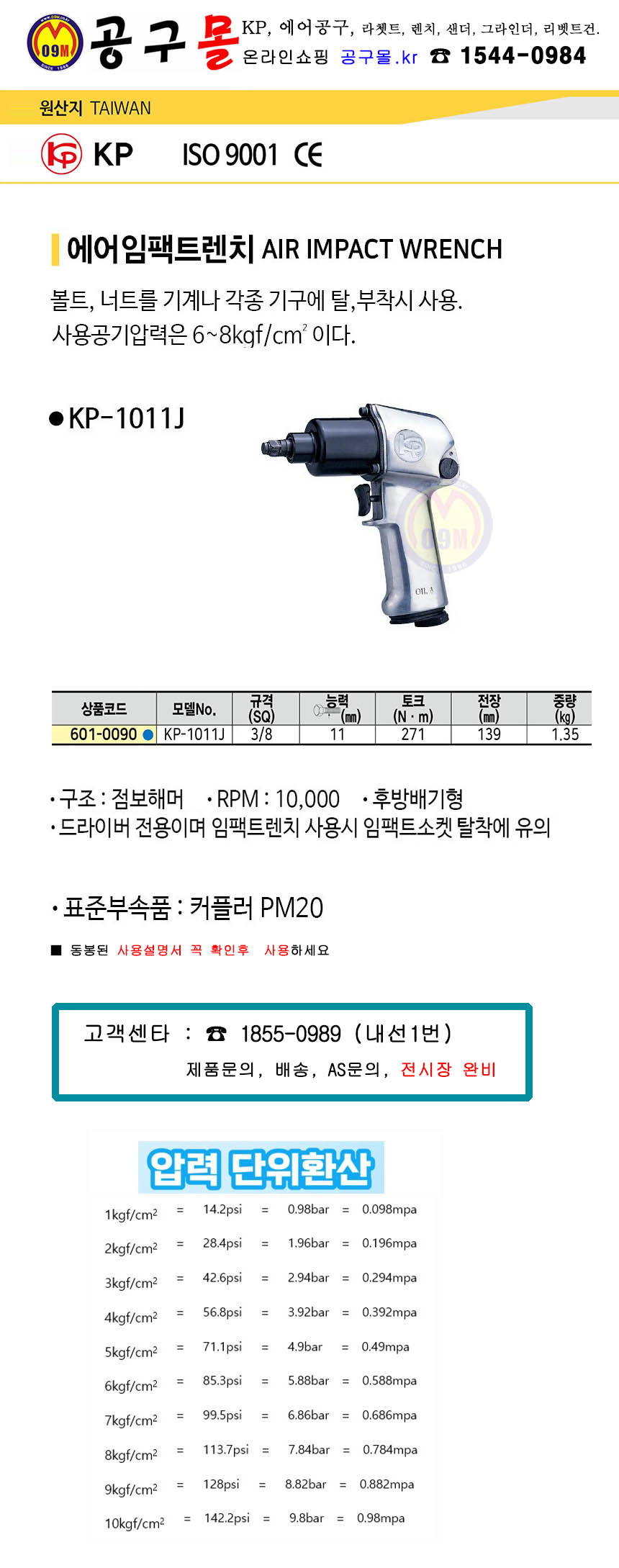 KP 에어임팩트렌치 KP-1011J (3/8SQ) 권총형 에어공구, 임팩트렌치, 에어렌치, 공구몰