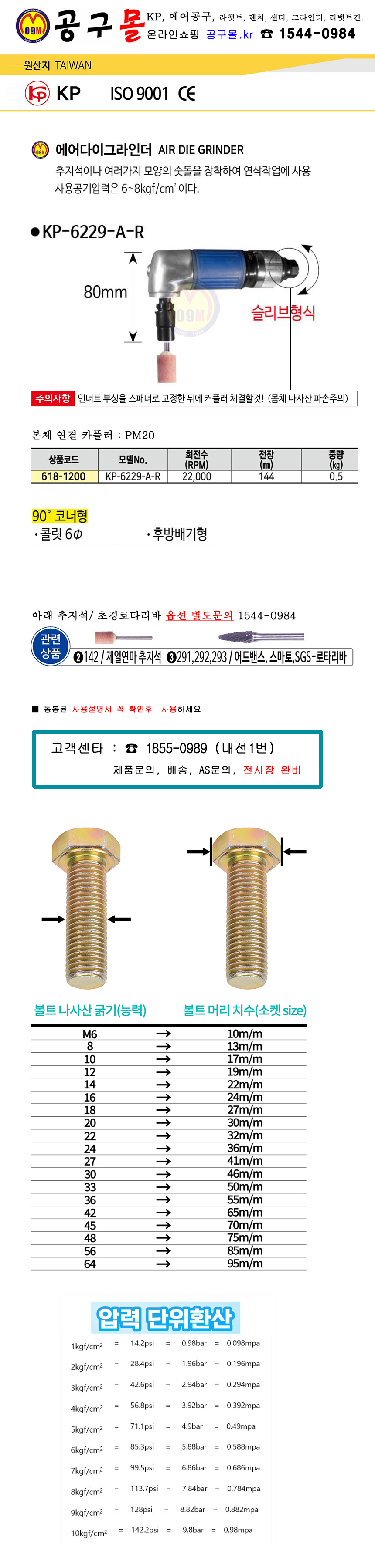 KP 에어다이그라인더 KP-6229A-R(90도 코너형) 에어공구, AIRTOOLS, 에어그라인더, 다이그라인더, 공구몰 618-1200
