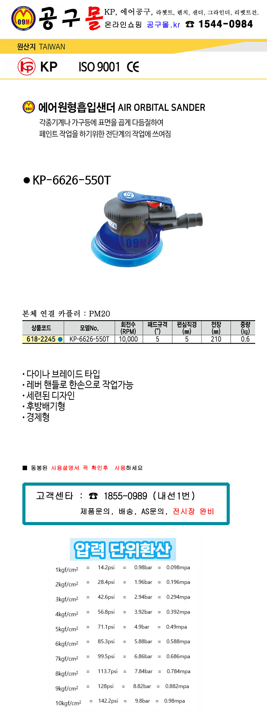 KP 에어원형흡입샌더 KP-6626-550T(5) 에어공구, AIRTOOLS, 흡입샌더, 원형샌더, 에어샌더, 공구몰 618-2245