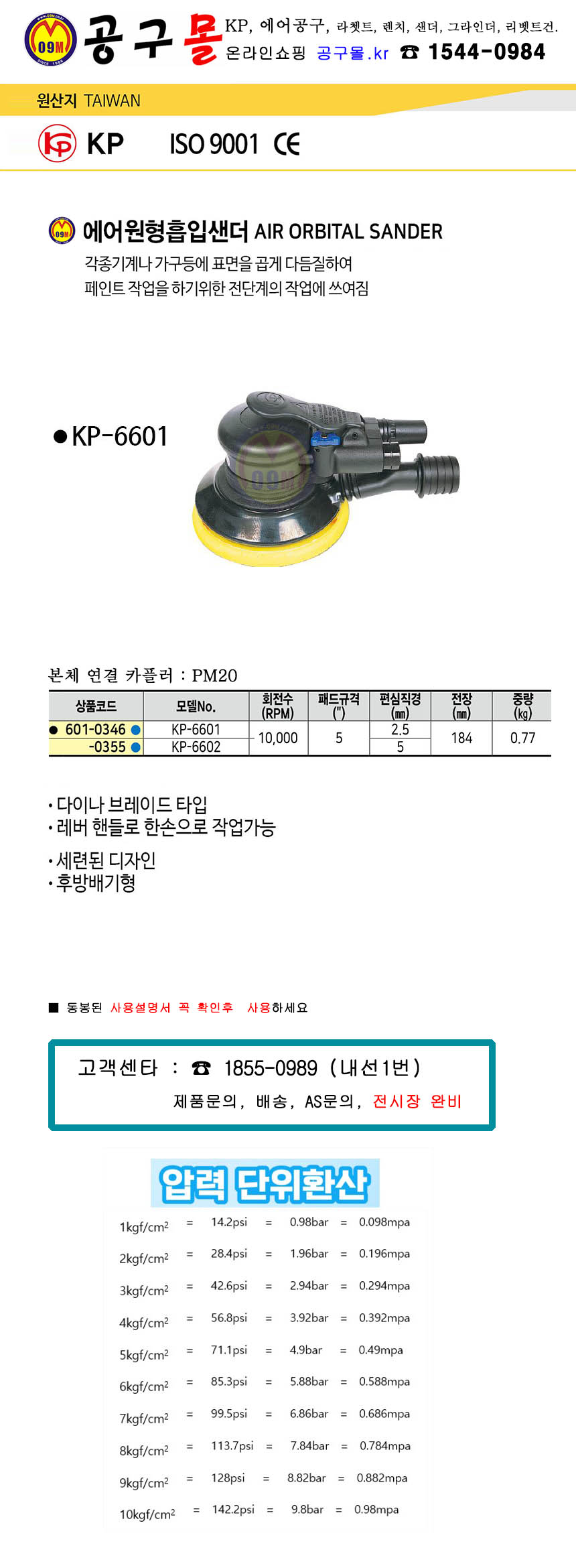 KP 에어원형흡입샌더 KP-6601(편심2.5), KP-6602(편심5.0) 에어공구, 에어샌더, 사포기 공구몰 601-0355
