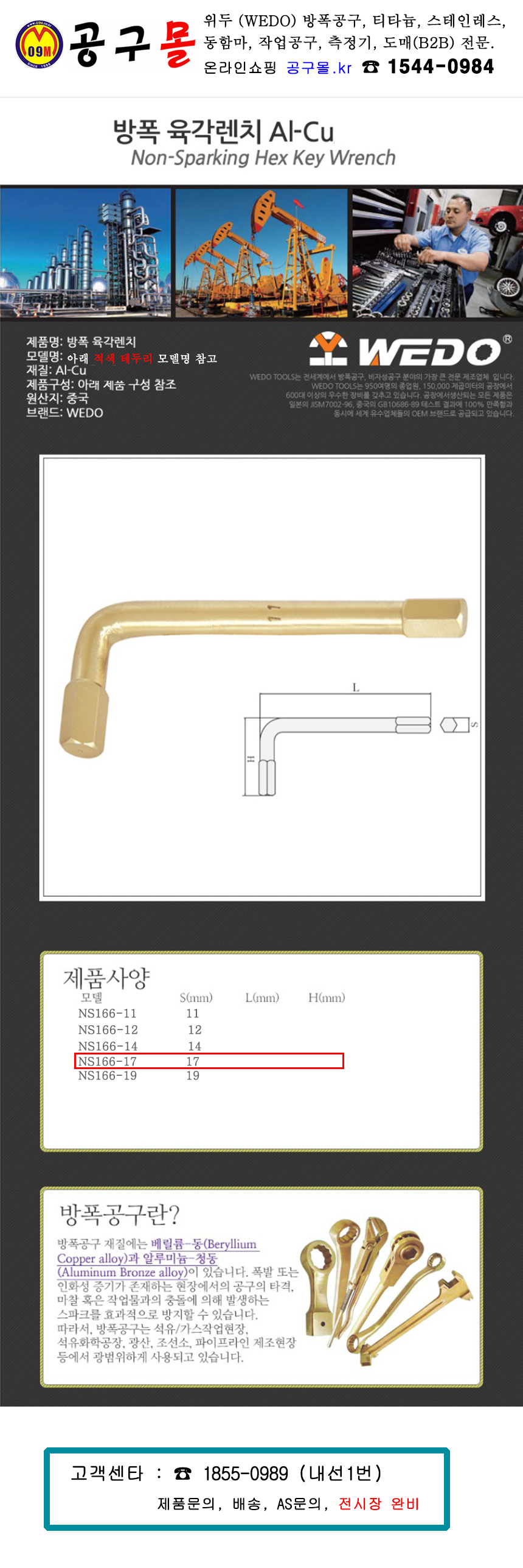 위두 방폭6각렌치(L형) AL-CU 17mm (NS166-17) WEDO, 공구몰, 방폭수공구, 작업공구, 800564254709