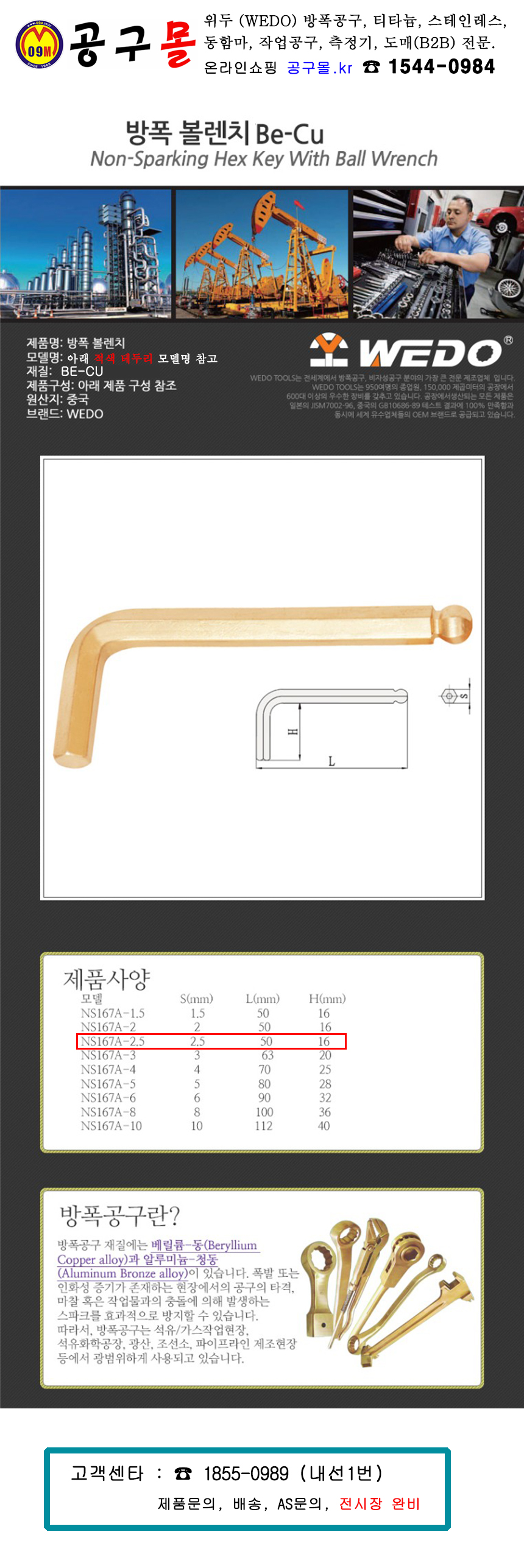 위두 방폭볼렌치(L형) BE-CU 2.5mm (NS167A-2.5) WEDO, 공구몰, 방폭수공구, 작업공구, 800564254921