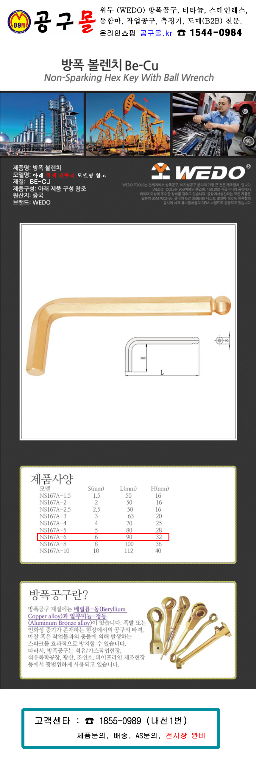 위두 방폭볼렌치(L형) BE-CU 6mm (NS167A-6) WEDO, 공구몰, 방폭수공구, 작업공구, 800564254822