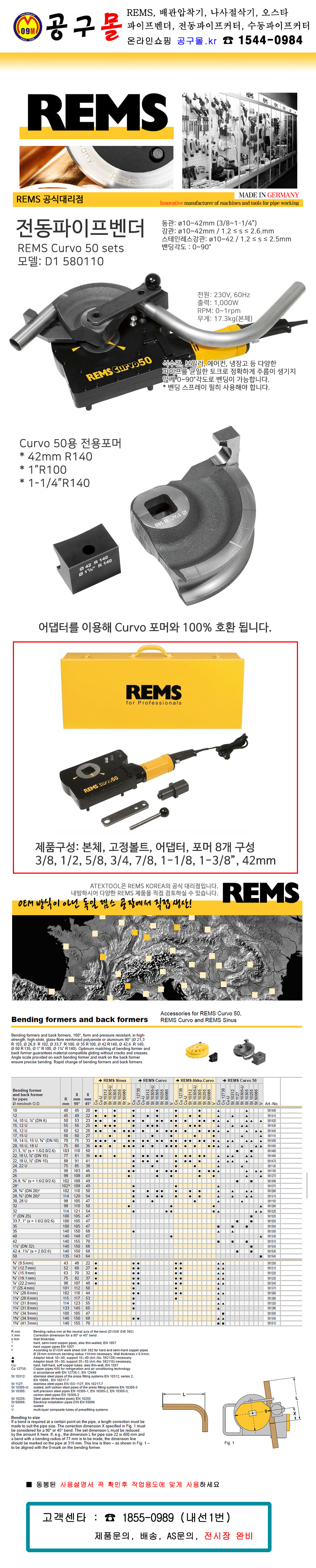 렘스 커보 50 풀세트 전동벤더 D1 580110 R220 10-42mm(11/4) 대형 풀세트(3/8-1/2-5/8-3/4-7/8-1 1/8-1 3/8-1 5/8(42mm) REMS