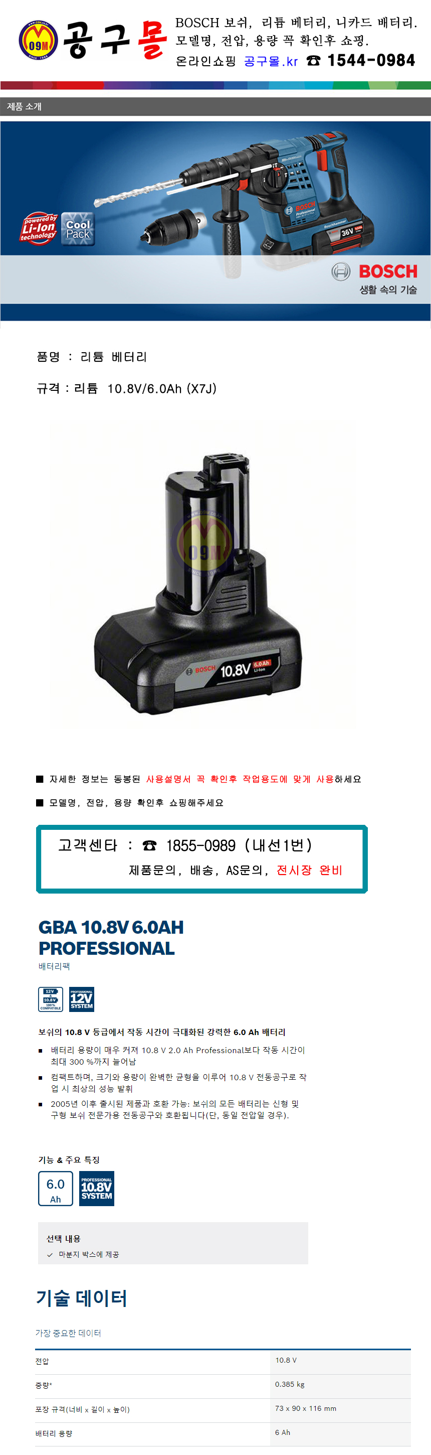 보쉬 10.8V 리튬 배터리 6.0Ah (X7J) BOSCH, 밧데리, 보쉬드릴용, 공구몰, 1600A00X7J, C524-0542