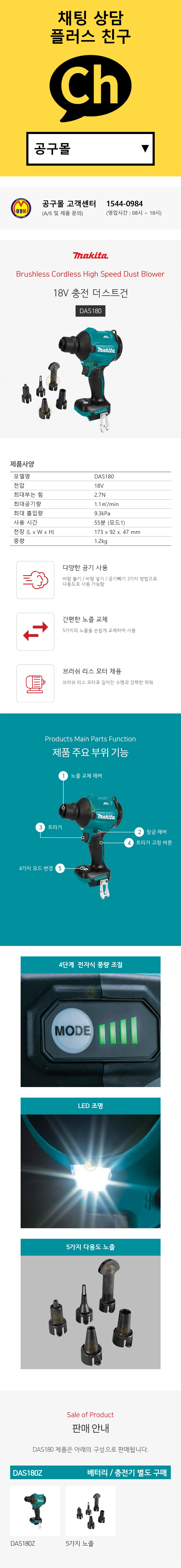 마끼다 18V 충전더스트건 DAS180Z (18V-베어툴) 브로워 송풍건 청소기 에어건
