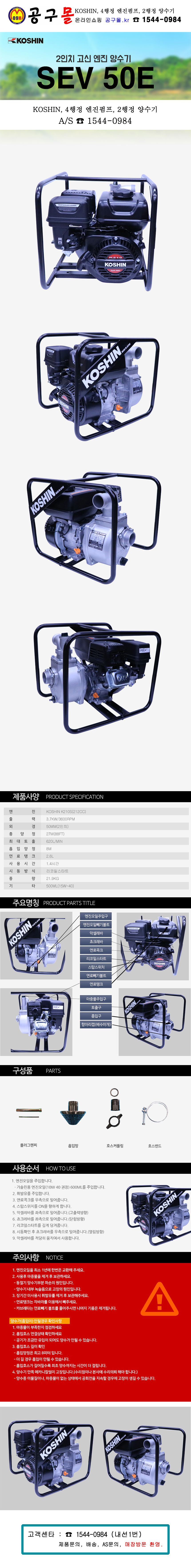 고신 엔진양수기(4행정) SEV50E (2) 고신엔진K210S 흡입8m,무게30KG,출력4.3Kw/3600rpm, 물펌프