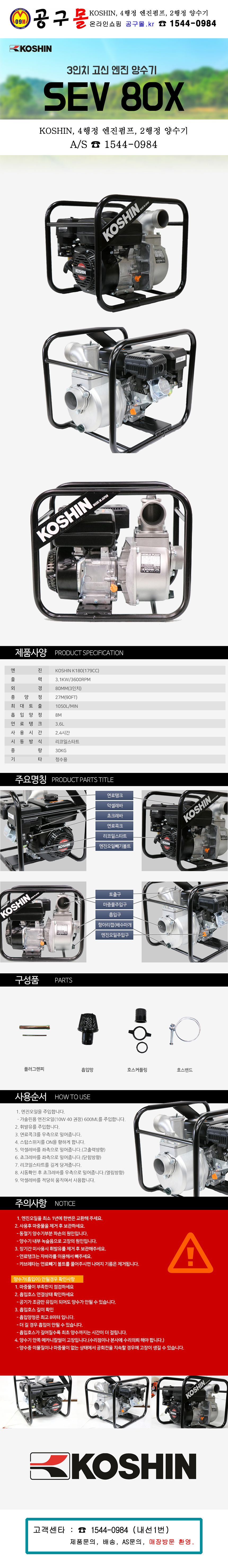 고신 엔진양수기(4행정) SEV80E (3) 고신엔진K210S 흡입8m,무게30KG,출력4.3Kw/3600rpm, 물펌프