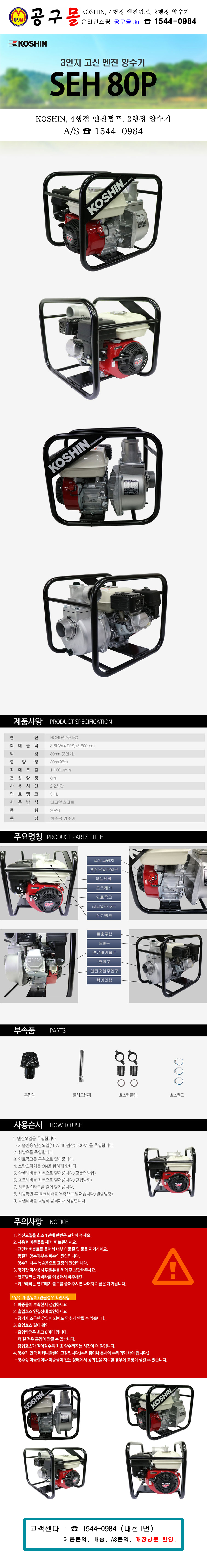 고신 엔진양수기(4행정) SEH80P (3) 혼다GP160엔진, 흡입8m,무게30KG,출력3.6kw/3600rpm, 물펌프
