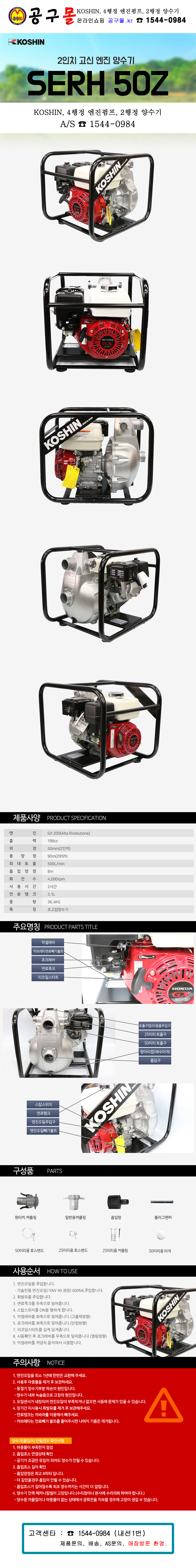 고신 엔진양수기(4행정) SERH50Z (2) 혼다GX200, 흡입8m,무게36KG,출력4.5Kw/4,000rpm, 물펌프