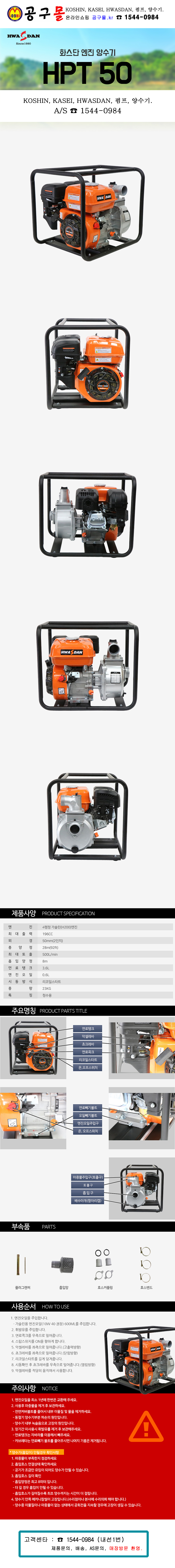 화스단 엔진양수기(4행정) HPT50 (2) 흡입8m, 무게23KG,196CC, 물펌프 (공구몰