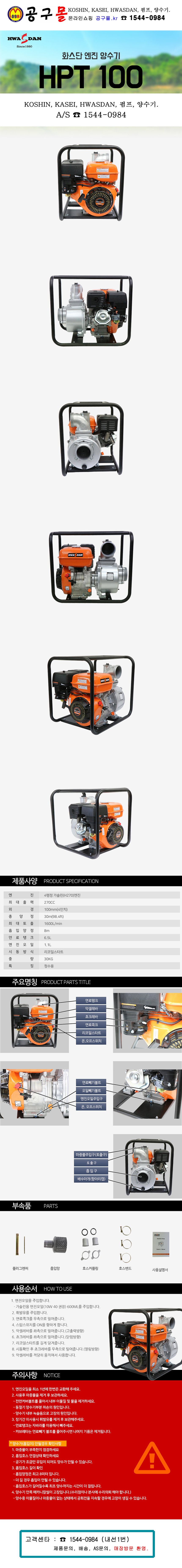 화스단 엔진양수기(4행정) HPT100 (4) 흡입8m, 무게30KG, 270CC, 물펌프 (공구몰