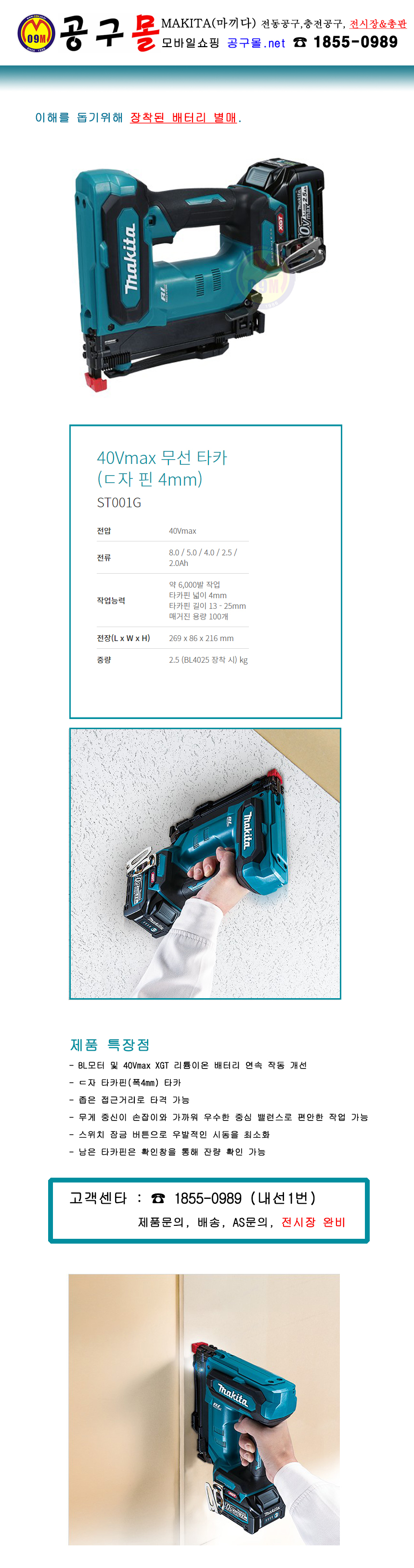 마끼다-40Vmax 무선타카 ST001G(본체만) 배터리별매, 422핀(ㄷ자핀4mm) 충전타카, makita