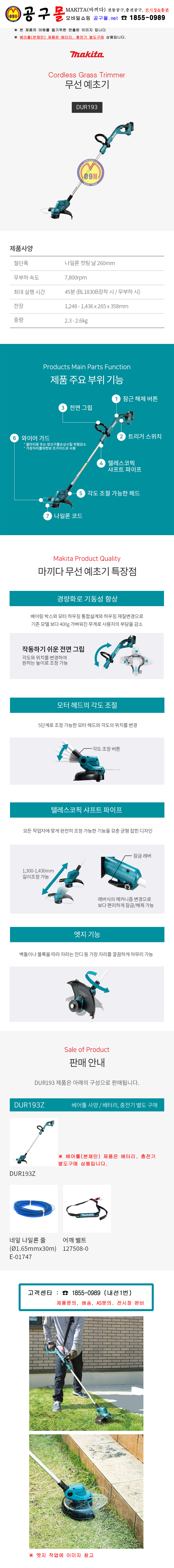 마끼다-18V 무선예초기 DUR193Z (베어툴) 충전, 잔디깍기, 엣지기능, 배터리, 충전기 별매, makita