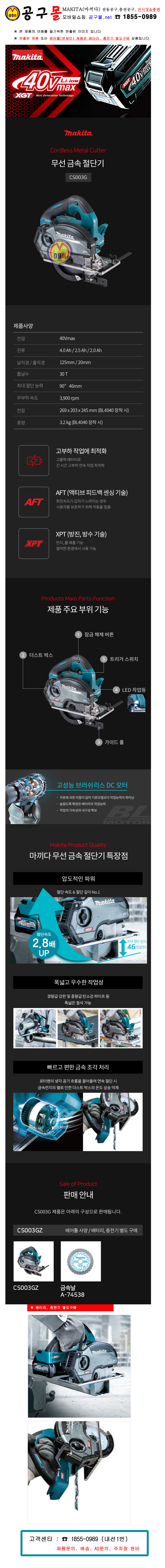 마끼다-40Vmax 무선 금속절단기 CS003GZ (베어툴) 125mm, 40V 충전, 판넬, 스틸절단기,공구몰