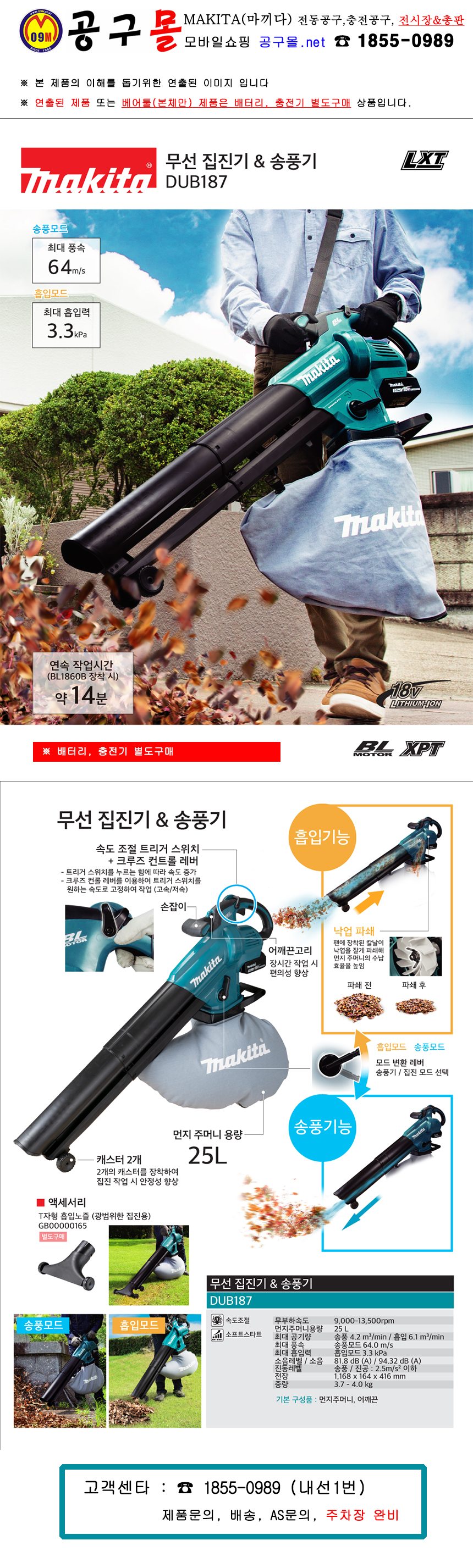 마끼다-18V 무선집진 & 송풍기 DUB187Z (베어툴) 충전브로워, 충전송풍기, 공구몰