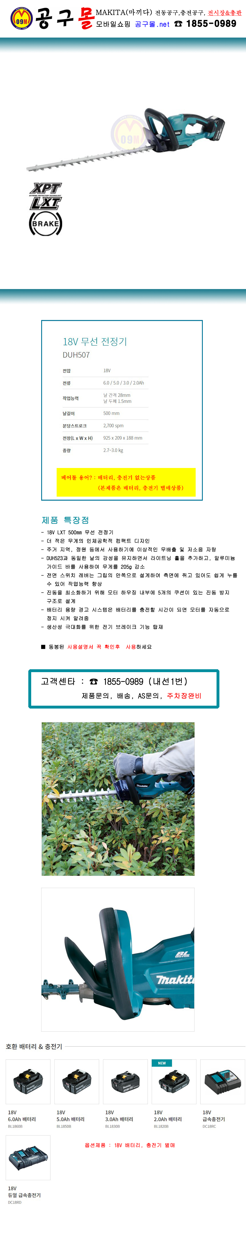 마끼다- 18V 무선전정기 DUH507Z (베어툴), MAKITA, 충전, 나무잎 트리머, 공구몰.