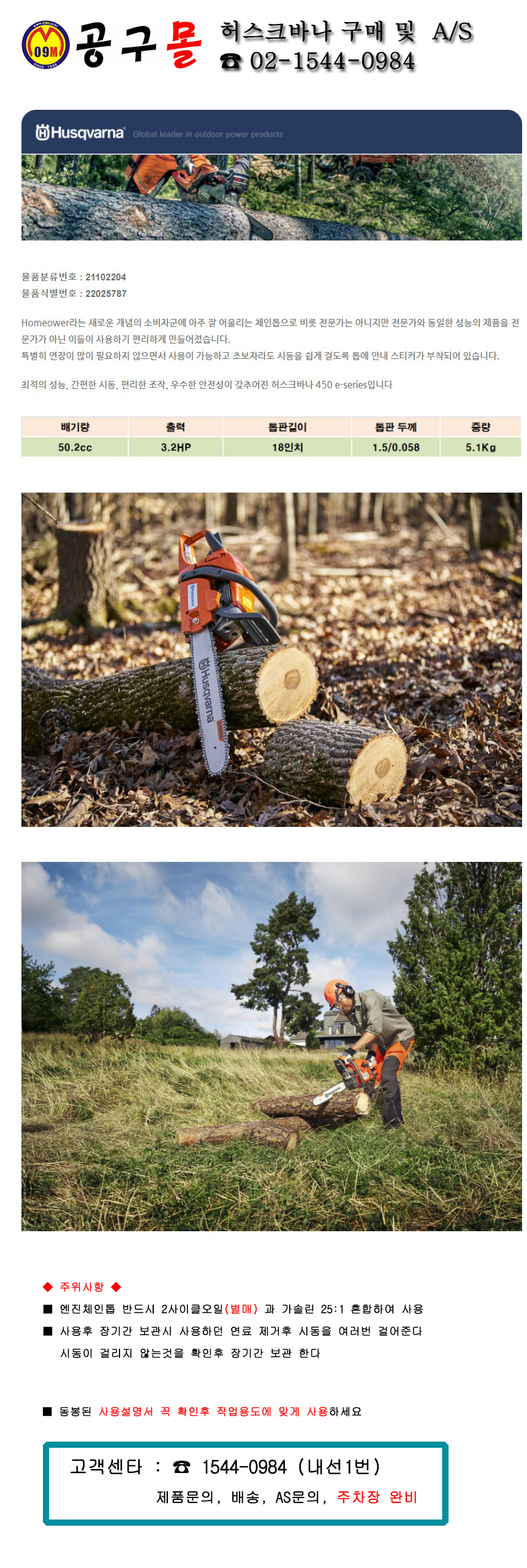 허스크바나 엔진톱 450II 50.2CC(18) 5.1Kg 체인톱, 공구몰