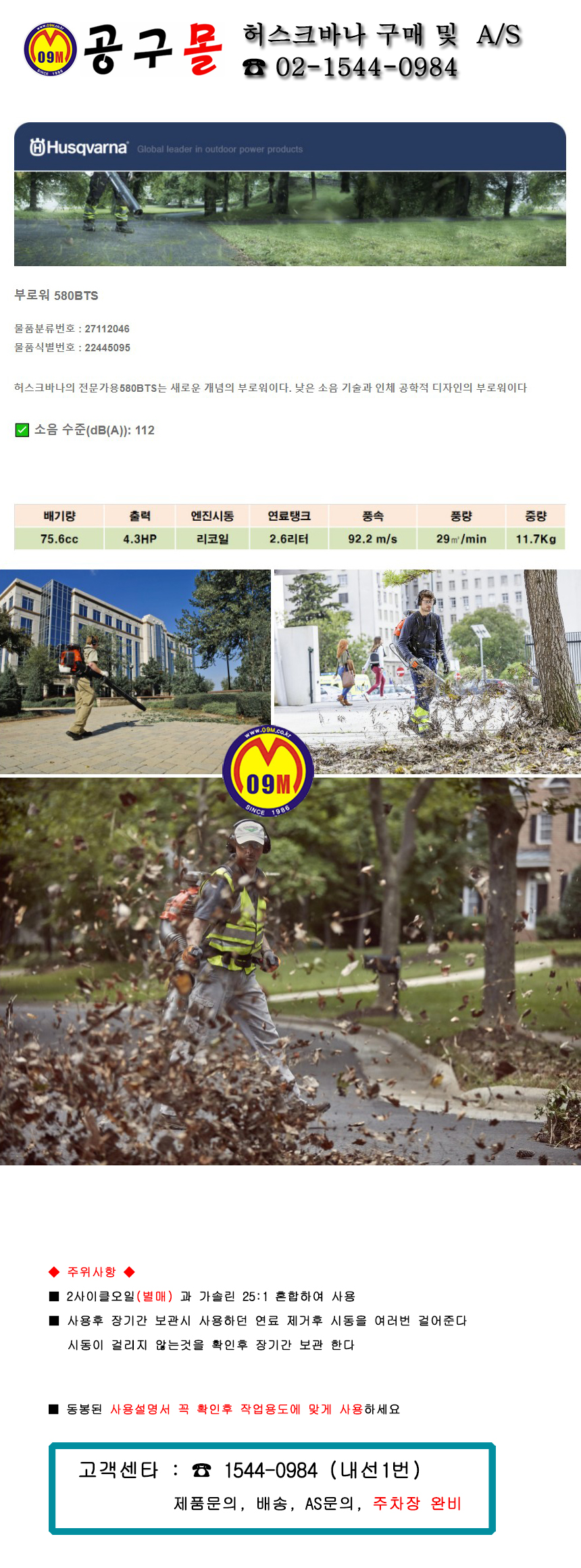 허스크바나 엔진 백팩 브로워 580BTS 75.6cc, 112dB, 92.2m/s, 낙엽청소기, 송풍기, BLOWER, 공구몰