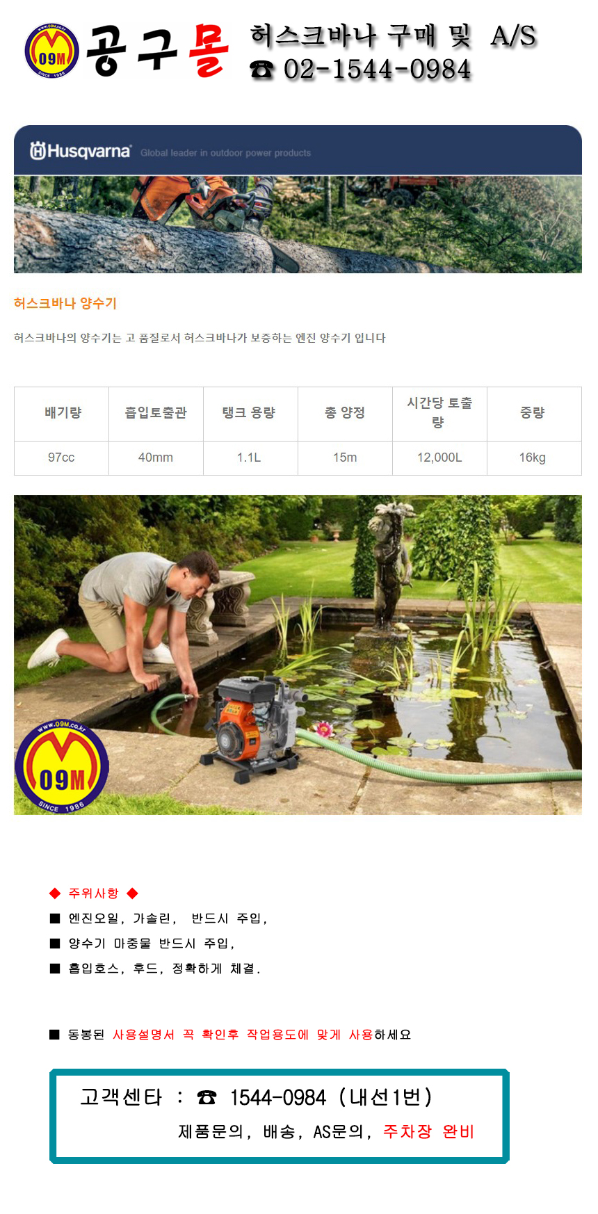 허스크바나 엔진 양수기 W40P (1.5), 97cc, 양정15M, 토출12000L, 물펌프, 공구몰
