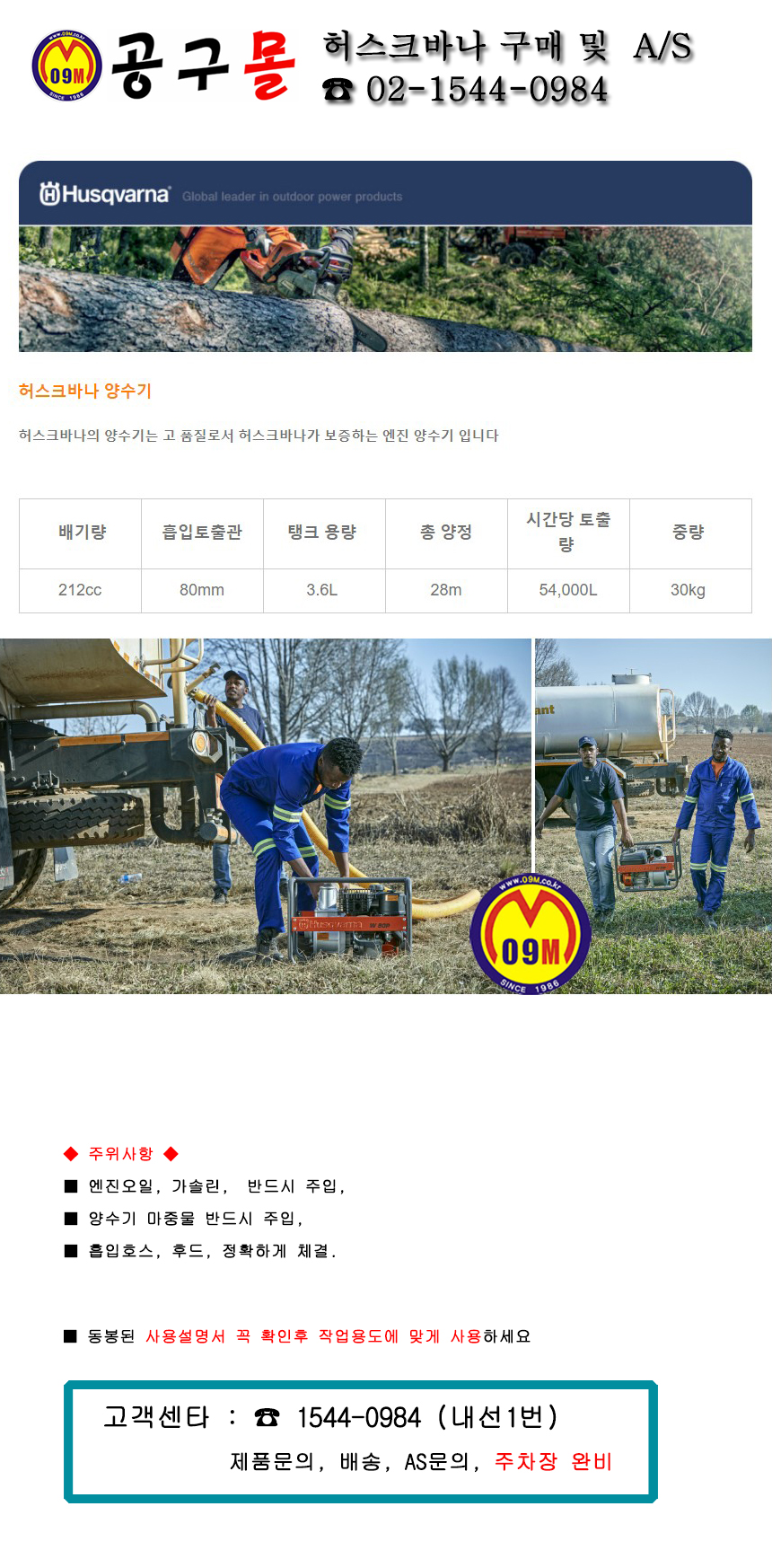 허스크바나 엔진 양수기 W80P (3), 212cc, 양정28M, 토출54000L, 물펌프, 공구몰