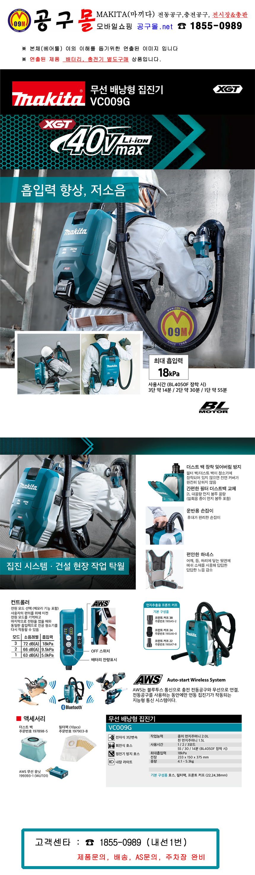 마끼다-40Vmax 배낭형 집진기 VC009GZ(베어툴) 18kPa, MAKITA, 공구몰 울산점, CORDLESS BACKPACK VACUUM CLEANER