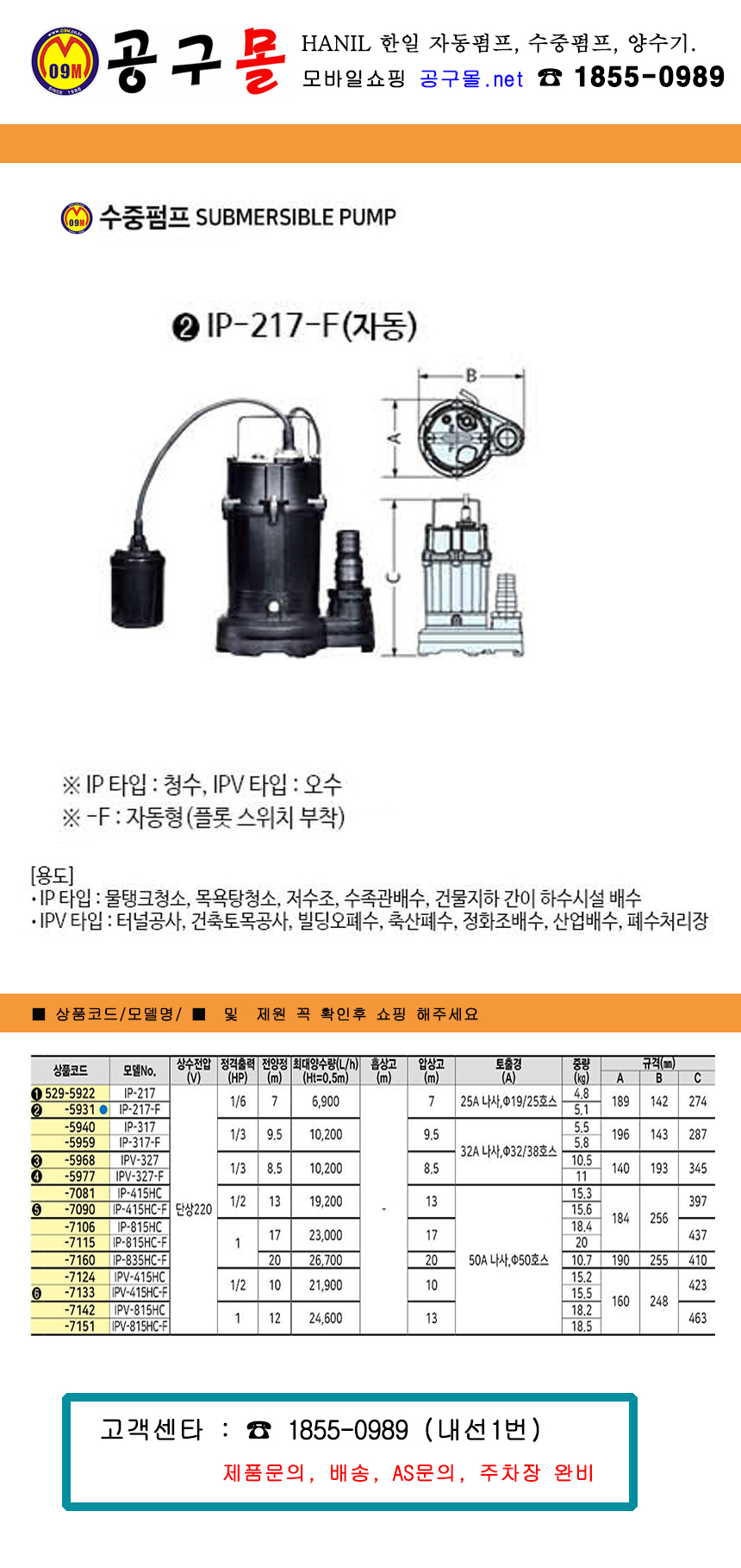 한일펌프 수중펌프 IP-217(수동) 1/6HP-220V